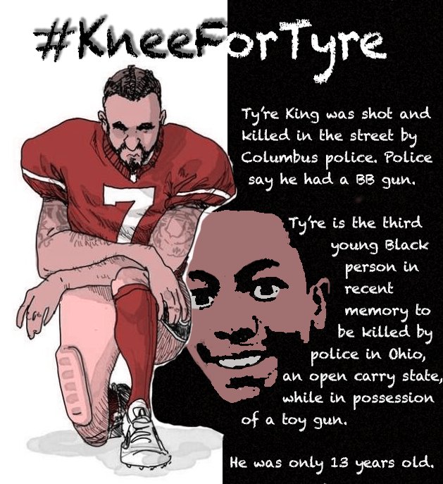 In light of his efforts, and the responses to it, it's worth revisiting the post below. Of note, activists in Columbus, OH, have also asked for supporters of racial justice to take a #KneeForTyre in calling for justice in the killing of Ty're King, a gesture inspired both by Kaepernick's efforts and as a nod to King's pee wee football team that attended his vigil on September 15th.